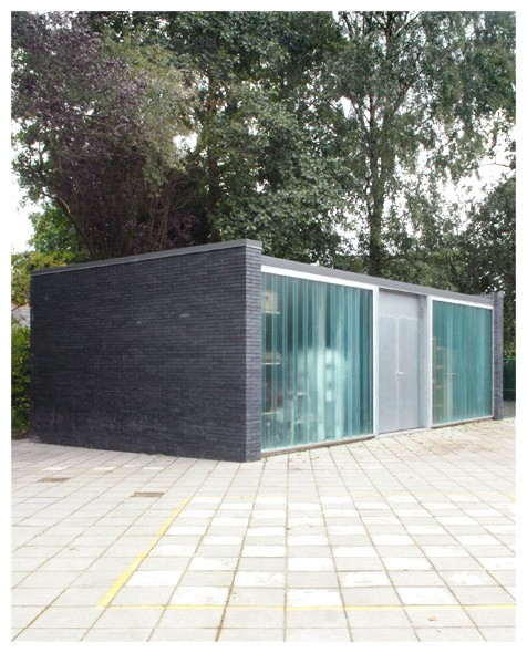 De fietsenstalling werd uit functioneel oogpunt ingeplant aan de straatzijde. De leerlingen kunnen hun fietsen stallen bij het betreden van de speelplaats zonder, zoals voorheen, de hele speelplaats over te steken, laverend tussen de spelende kinderen. De inrijpoort wordt opgeschoven naar het bestaande laagbouwblok toe. De overdekte fietsenstalling wordt rondom afgesloten met een groenwand; een hekwerk met begroeiing, zodat de fietsenstalling een verdikking lijkt van de bestaande haag die de speelplaats afsluit.