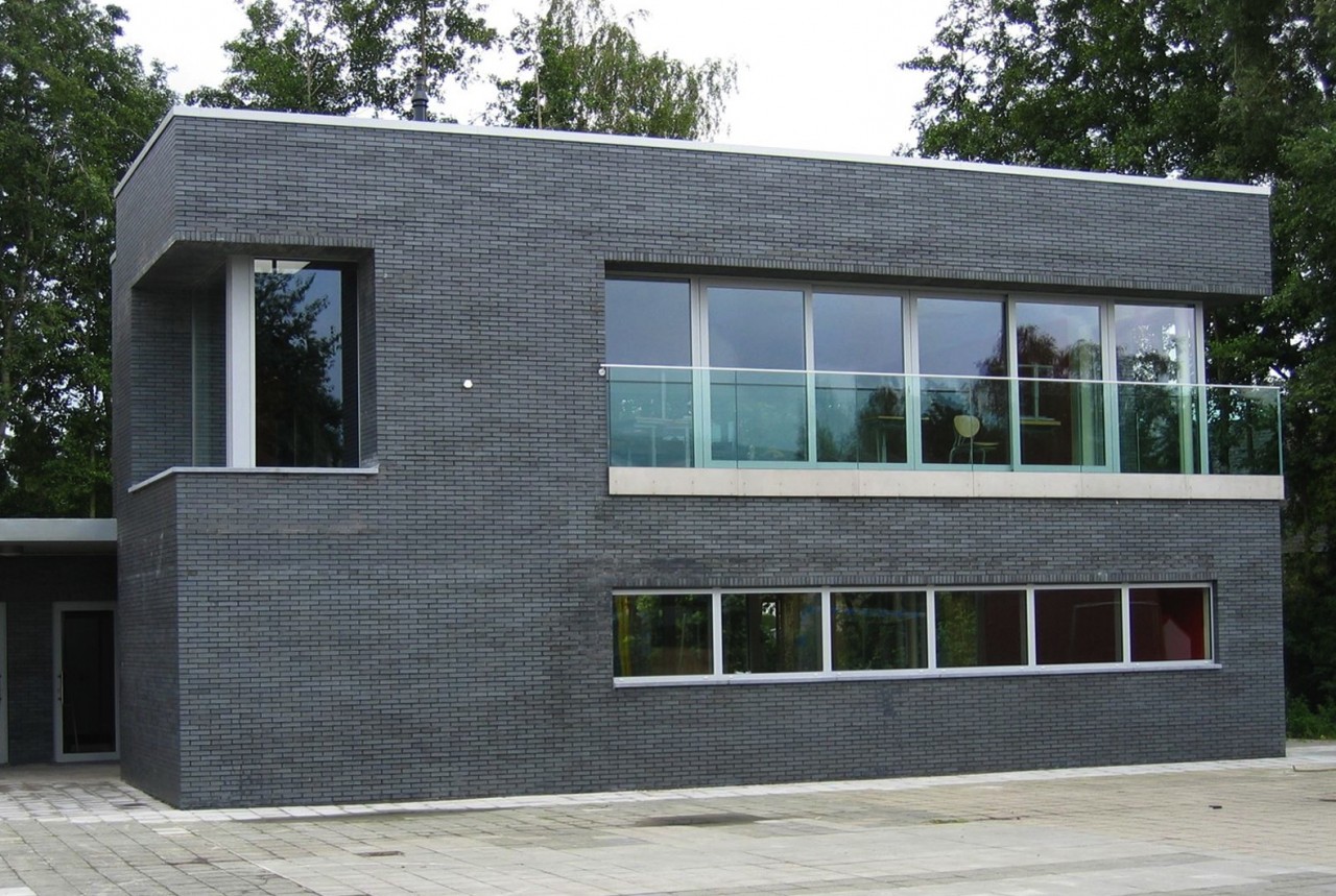 Het nieuwe klassenblok wordt opgebouwd uit donker gelijmd metselwerk : een hedendaagse variant op het bestaande traditionele metselwerk van de bestaande gebouwen. Elke klas beschikt over hoge schuiframen tot op de grond. In open toestand krijgt men als het ware een buitenklas. Op de begane grond heeft de klas hierdoor directe toegang tot de speelplaats. Op de verdieping is een terrasje voorzien waardoor men ook daar de ramen kan openen en men de grote raampartijen makkelijk kan reinigen. De leuning met glas is kindvriendelijk, veilig en vormt geen visuele hinder vanuit de klas.